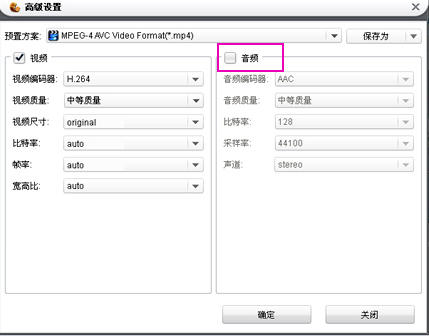 2、打开高级设置后,将右侧的取消音频打钩,然后点击确定。