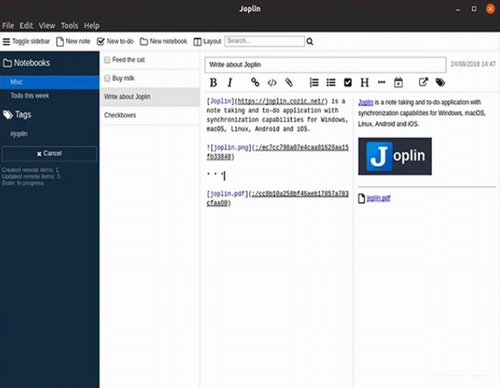 Joplin中文版是一款很好用的云笔记软件,Joplin不仅可以帮助用户处理大量的笔记,而且Joplin的界面简洁而美观,能够支持云储存,可以在不同设备之间进行同步,能够帮助大家轻松快捷的处理笔记本中组织的大量笔记,还用于对电脑的加密,支持Linux、Windows、macOS、Android 和 iOS系统,不仅可以帮助用户编辑笔记和记录各种待办事项,还支持将网页保存为笔记。除此之外Joplin还能够通过网盘实现跨设备同步,使用起来很方便