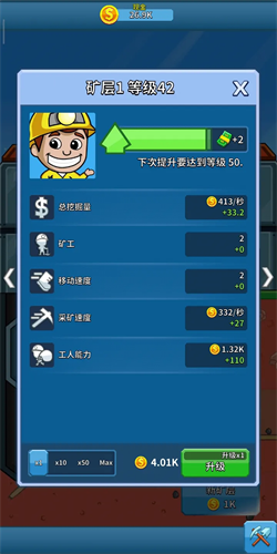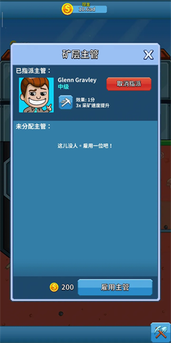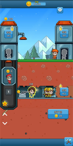 5、随着每层等级的上升以及矿层的数量增多,玩家在闲置的矿业大亨游戏中除了拥有矿工的数量上线会有所提升外,还会额外开启矿工主管、矿工技能、技能升级等辅助功能,帮助玩家有效的提高生产效率,在放置期间挖掘出更多的矿石,售卖出更多的金币,为玩家商业帝国的平地而起添砖加瓦。
