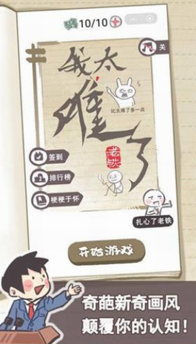 我太难了老铁完整版是一款十分有趣好玩的休闲益智类手机游戏,在《我太难了老铁》这款游戏中玩家必须在限定的时间内,通过仔细观察,找到图中不合理的地方,达到通关,游戏采用经典关卡模式,为所有玩家精心打造所有的关卡,关卡内容丰富,有着非常奇葩的游戏画风,还有各种闯关趣味的游戏,带给玩家深刻的印象,喜欢这款游戏的玩家快来一起下载体验吧!
