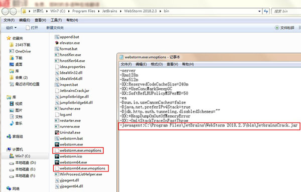 7、在C:\Program Files\JetBrains\WebStorm 2018.2.3\bin目录下以记事本打开以.exe.vmoptions和64.exe.vmoptions结尾的两个文件并后面添加代码-javaagent:C:\Program Files\JetBrains\WebStorm 2018.2.3\bin\JetbrainsCrack.jar然后保存