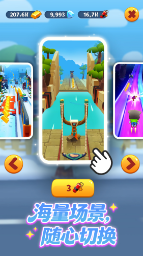 这不是普普通通的跑道。穿越地铁的秘密隧道、迷失之城、糖果之地、海底甚至外太空,享受无尽的乐趣。在跑酷过程中,还有许多新场景等待你来发现。
