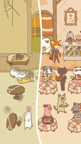 3、趣味的模拟游戏,休闲的放置玩法,争取让每个顾客都感到满意,获得更多小鱼干。