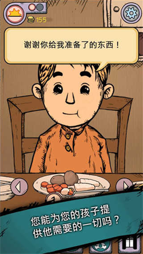 4、在游戏中搜集食物,工作赚钱,同时帮孩子做饭、缝补衣物,陪孩子一起玩