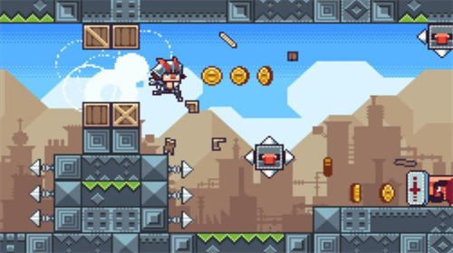 1、采用复古像素画风,控制战士跳跃冲刺避开障碍物,消灭敌人;