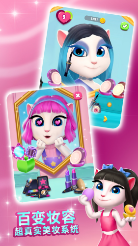 安吉拉也是需要美美的!除了日常的梳毛外,我们可以在化妆间里面,帮助安吉拉涂口红、涂眼影、画眉毛,每个化妆品都有不同的颜色和样式,我们可以打造安吉拉的独特风格。只有你想不到,没有游戏做不到。我们在游戏中可以帮助安吉拉换肤色,换发型,或者换日常的服装,衣服的款式非常多,总有一款你喜欢。