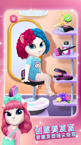 时尚爱好者注意啦:安吉拉有一个专为时尚而设的迷人房间!漂亮的衣柜里满是服装和配饰,巨大的化妆台让你可以畅玩化妆游戏,迷你发廊让你可以尝试各种新发型。帮助安吉拉设计发型,用时尚和美妆来展现自我。