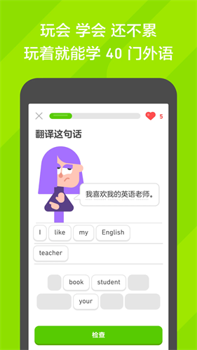 多邻国游戏化教学课程,好玩到停不下来!一关接着一关慢慢闯,不只扎实学习、巩固记忆,更累积了成就感!