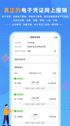 3、仅用身份证既可乘飞机和火车,行程结束用电子凭证报销,免去取票贴票之苦。
