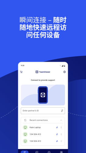 《teamviewer手机版下载官网中文版》是一款功能强大实用的远程控制软件,软件不仅支持电脑远程电脑,而且还支持手机远程电脑或者电脑远程手机等操作,使用方法非常简单,用户只需输入id和密码即可远程操作,能够支持文件双向传送、支持多监视器、支持实时语音和视频传送等等,是远程桌面连接的最简单的解决方案,而且这对于个人用户而言完全免费的,并且用户可以随时随地在手机上轻松、快捷且安全地对Windows、Mac和Linux系统进行远程访问,轻松实现以下操作:身临现场般地对计算机进行远程控制,在路途中为客户、同事和朋友提供访问办公室台式机上的所有文档和已安装程序,远程管理无人值守计算机(如服务器),可以满足很多用户对远程的需求。