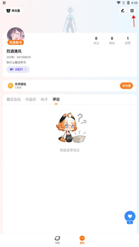 1、进入233乐园,点击我的,点击右上方按钮所指地方;