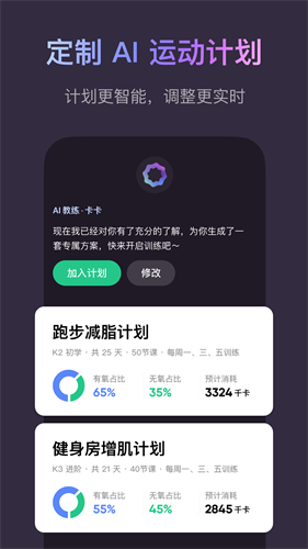 3、多种健身训练,供你选择:训练计划针对不同人群、各种器械和健身目标组合编排,适用广泛的健身场景。