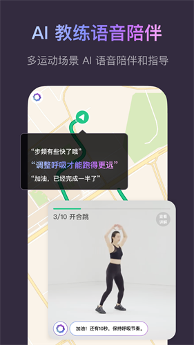 1、陪伴式跑步,让跑步不再孤单:跑步全程语音,还可以指导你的呼吸和配速,高效跑步,更可陪伴你。