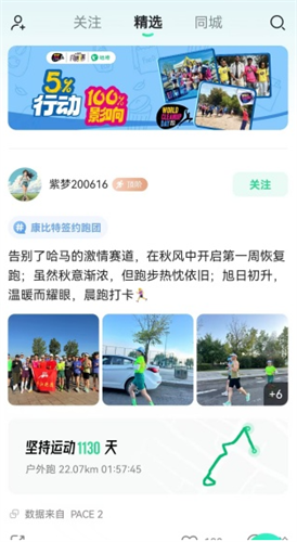 1、在主页面的精选模块,大家能看到坚持运动1130天这个功能区,直接点进去。