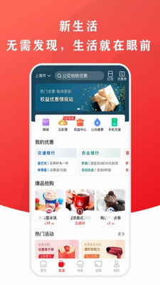 3、权益中心:一站式汇总银行卡优惠、权益,涵盖衣食住行多个场景,打造用户权益查询、获取、使用顺畅新体验。