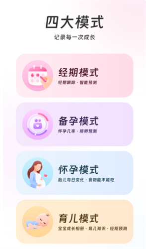 2、开启经期、备孕、怀孕、育儿四大模式,陪伴你从校服到婚纱,从少女到妈妈,不同时期可给你特殊的照顾。