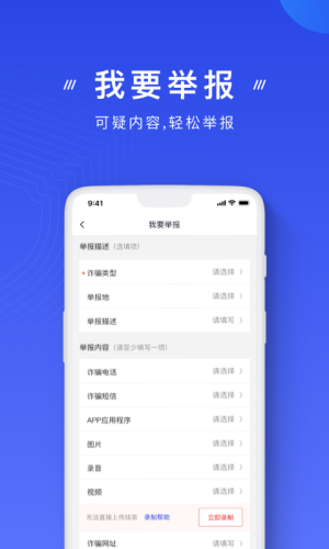 3、通过这个软件可以快速的举报诈骗内容帮助他人提前防范,还是可以一键开启录屏录音,上传诈骗线索。