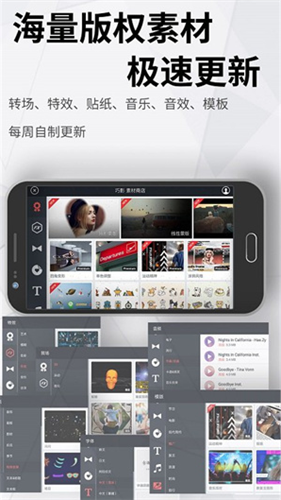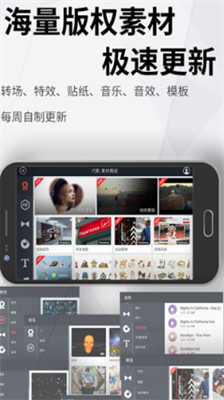 1、素材商店提供数千种音乐、模板、字体、贴纸、转场,以及更多增强视频的功能素材,每周实时更新。