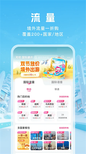 无忧行app下载安装2025是一款由中国移动打造的一站式生活服务,集通信、吃、住、行、游、购于一身,满足用户多元出行服务需求,可以免费上网打电话,可以一键文字、语音翻译,更有出行攻略、谷歌地图等,也是你出境旅游的好伴侣,无忧行依托中国移动强大的通信能力,为您提供经济实惠,方便快捷且信号稳定的境外通讯方式,无忧行以通信服务为基础,覆盖260+目的地的多种出行场景,满足用户境外上网通讯,吃喝行玩购需求,是专门为出境旅行的中国人度身打造的出境游生活服务门户APP,有需要的用户可以下载使用。