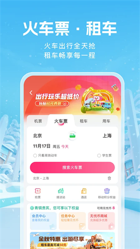 ●火车票:具备12306直连能力,实现境内全线路覆盖,提供抢票&选座等增值服务;