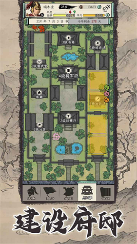 2、升官后你一时间修家,优先练武场-议事厅(每回合送资源和好感度)-兰亭和书斋-冶兵坊-马舍,剩下的……都可以不修了,修也行。