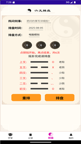1、支持阴阳爻排盘、钱币排盘、卦名排盘、数字排盘和日期排盘。