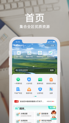 【首页】聚合使用频率、个人关注较高的便民服务功能,新增专题推荐、猜你想办模块。