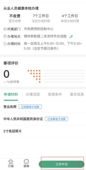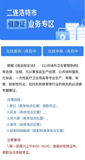 3、 选择“在线查询”即可查询到健康证相关信息,选择“在线申报”即可申报健康证
