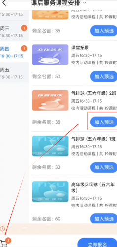 预选时间段内,家长可将心仪的课程加入预选清单。预选结束时,若该课程预选人数未达报名人数上限,则系统会在预选结束后自动提交报名,报名阶段无需家长手动报名;预选结束时,若该课程预选人数超过该课程报名人数上限,则家长在报名阶段需手动报名该课程。预选期间,家长可实时查看课程的预选人数是否达上限,建议家长根据需要实时调整预报名课程清单。