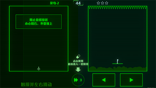 第二关就不一样了,有点小难度,在左边的方框中,玩家需要控制下方的飞机射杀敌机的小飞机、五边形的石头,注意别让敌机靠近,小心不要撞到陨石。而右边的方框中,你需要控制一个白色的小人,按住左右的按键可以控制小人左右活动,脚下的小木板会逐渐升起,如果挨到头顶的尖刺就会死掉,而随着这个木板的升起,会有其他的木板跟着从下匀速升起,我们要做的就是控制小人左右移动跳到下方的木板上,不断的向下使得小人不会坠地也不至于被头顶的尖刺万箭穿心。