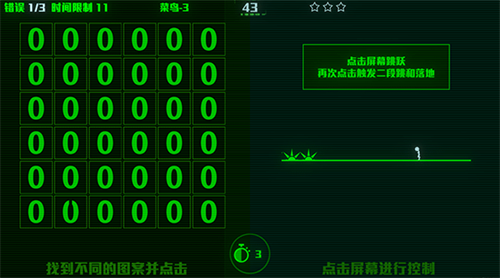 第三关其实是很难的一关,不知道大家玩起来感觉如何,左边的方框内玩家需要找到不同的东西并点击,讲真的有点眼花,右边的方框内必须点击屏幕让小人越过前面的障碍物,不要让小人被扎死。