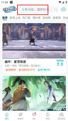 1、下载安装好本站提供的taptaptap,来到首页之后可以看到很多推荐的游戏,或者是当下热门的手游,如果看到喜欢的推荐游戏可以点进去。如果有自己喜欢的游戏,我们点击最上面的搜索框。