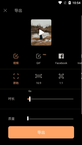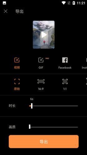 1、首先点击右上角的导出功能来到导出的页面,然后再这里选择一个视频,还可以选择导出视频的时长、质量和画面比例。