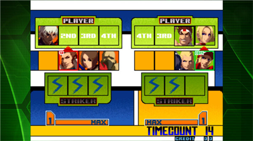 6、 连续输入两次半圆指令释放超必杀,如草薙京"大蛇薙"+八神庵"禁千二百十一式"触发合击特效。