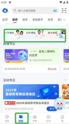 1、进入智慧中小学App,在【资源】页面选择课程的类型。