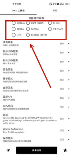 1、想要使用用gfx工具箱官方正版来提高pubg、地铁逃生画质的话,大家需要先在主页的顶端点击选择不同的版本,其中包括有国际服、国服、韩服和台服等八个版本,在选择后就能对画质进行自定义修改了。