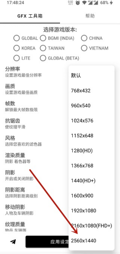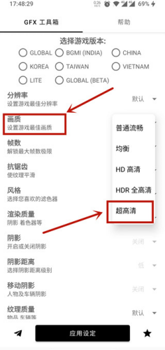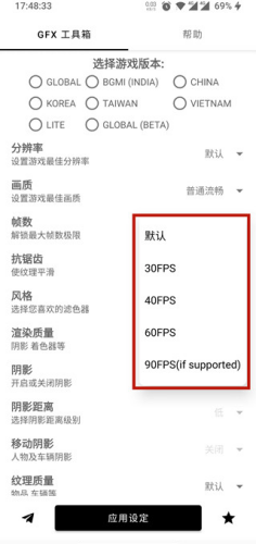 5、此外在gfx工具箱内还可以设置抗锯齿、阴影、纹理等多种数据修改,在设置完成后,点击底部“应用设定”既可开始体验啦!