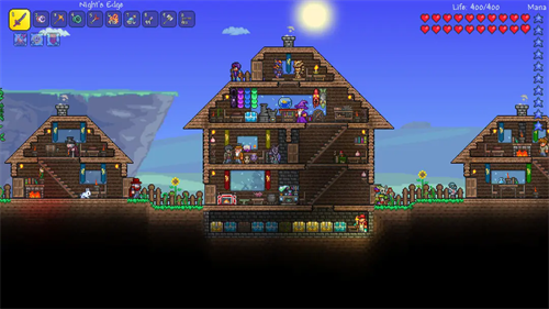 3、地面生活有日夜交替。在早晨,玩家可以到处乱跑也可以建造各种庇护所等等;而当夜幕降临后,僵尸和各种眼球怪就会出现,要么杀死他们,要么就逃走。地面惬意的生活让人流连忘返。