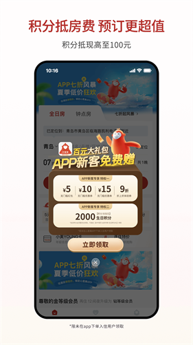 2、【积分最多 可抵房费】 作为会员积分最多的酒店预订平台,心里美会员积分可直接当钱花,让您的预订更超值。每消费1元累积1积分,积分直抵房费,最高抵扣100元/单。为您带来经济实惠的同时,更不失高品质的旅宿体验。