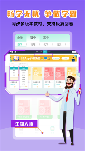 1、同步校内教材:小学语文、初中物理、初中化学、初中数学、高中物理、高中数学、高中化学这里都有,紧跟课本教材,单一知识点,考点、难点、重点一一讲解。预习、复习、考试、日常学习大师全搞定。