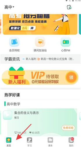 1、点击发现显高中学习平台,含会员特权、课间加油站等板块,热学课程里高中数学预习课可免费看。