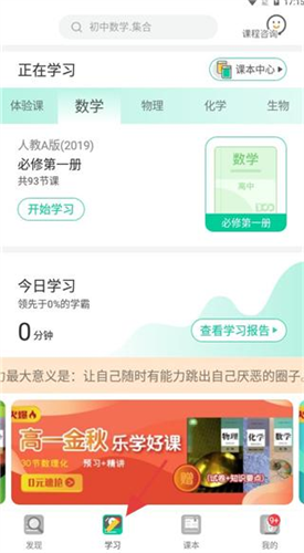 2、点击学习界面呈现课程进度,有人教A版数学必修一,显示今日学习情况,还推高金秋学习好课。
