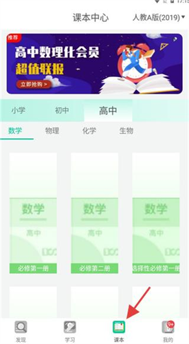 3、点击课本中心分小初高,聚焦高中数理化生,展示数学必修及选择性必修课本,方便查找学习。