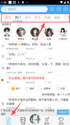 1、进入APP后,在首页可以根据顶部热门、流行等栏目找到你想要听的歌曲。