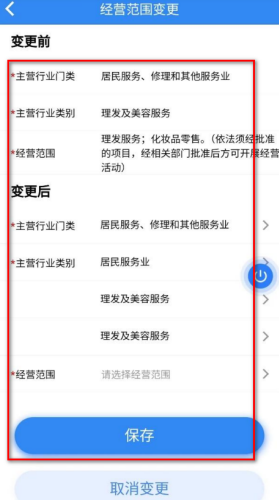 4.在第2步点击经营范围变更,然后填写新的信息之后点击保存。