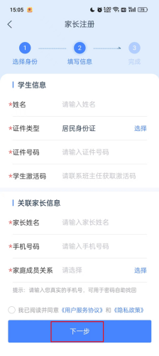 三、在填写信息页面,完成【学生激活码】等重要信息的录入后,勾选协议, 再次点击【下一步】,若填写的信息无误,即可完成注册