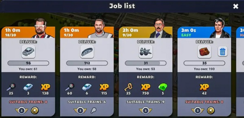游戏为您提供任务,或者称之为“工作”。基本上你必须向他们提供一定数量的某种商品。没有时间限制,但有些工作需要某种类型的机车。您可以在上面的屏幕截图中看到,一些工作没有“合适的火车”,这意味着我没有任何合适类型的免费机车(史诗)。