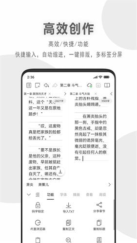 3、高效写作,自动缩进,一键排版,敏感词高亮提示,快捷标点、人名,实时字数、时速,码字锁定,全书查找、全书排版、章节历史等功能给您更便捷的写作体验。