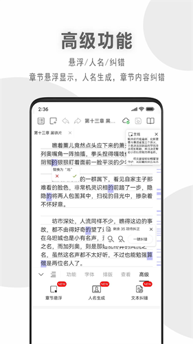 4、高级功能,章节悬浮显示,人名生成,章节内容纠错等,让您的创作更轻松。