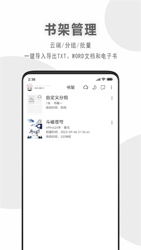 2、书架统一管理,书籍自由分组,TXT、WORD、EPUB电子书随意导出。